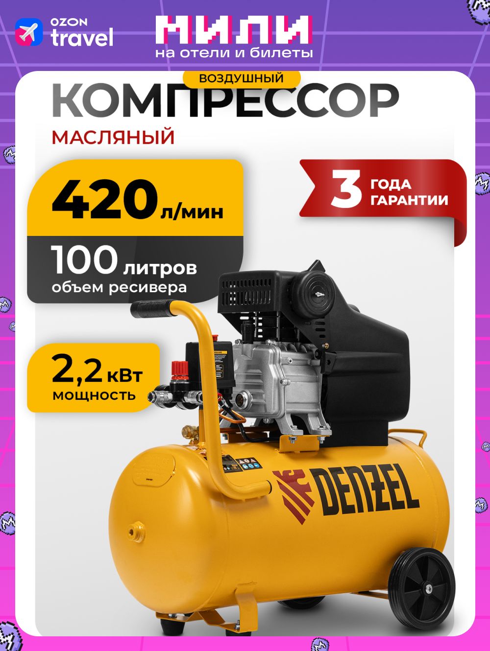 Компрессор воздушный DENZEL DC1500/50, 1.5 кВт мощность и 220 л/мин производительность, ресивер 50 л, предохранительный клапан и манометры, масляный 58161