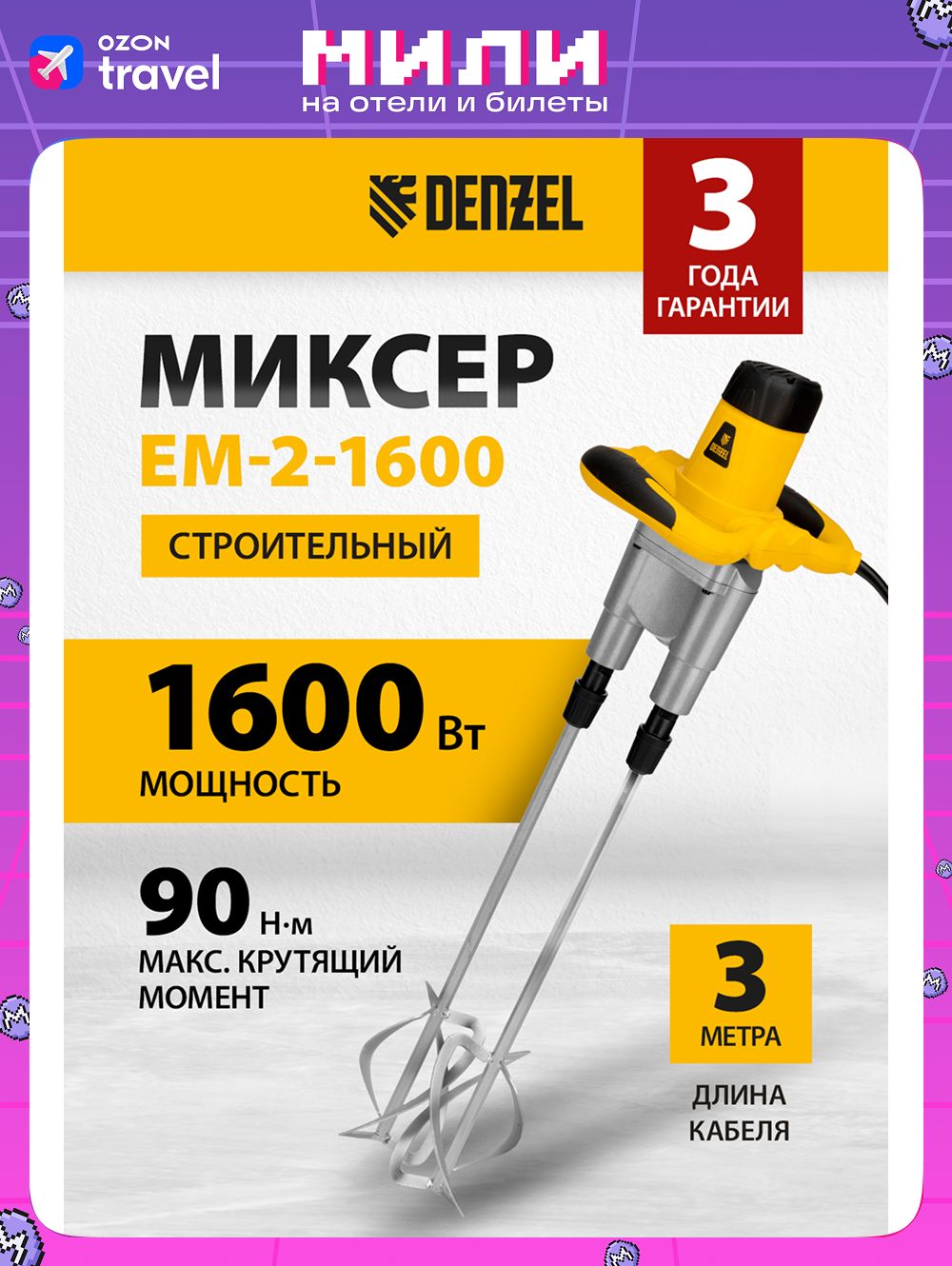 Миксер строительный электрический DENZEL EM-2-1600, 1600 Вт мощность и до 680 об/мин частота вращения, электронная регулировка и плавный старт, фиксатор кнопки пуска и обрезиненные рукоятки, 27911