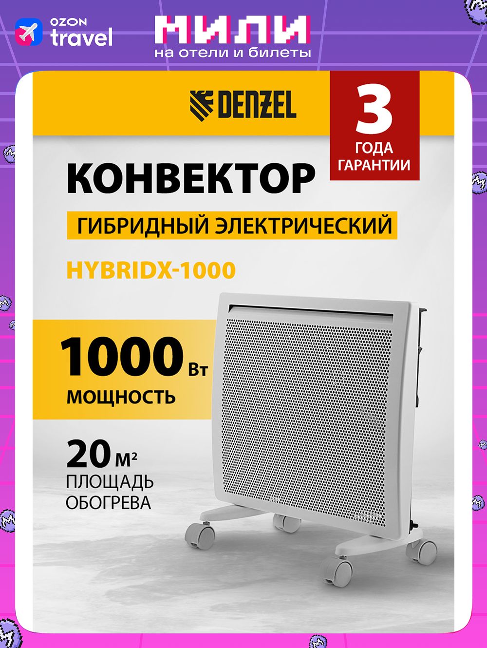 Конвектор электрический DENZEL HybridX-1000, 1000 Вт мощность и 20 м2 площадь обогрева, цифровой термостат и таймер, датчик открытого окна и система защиты, гибридный 98118