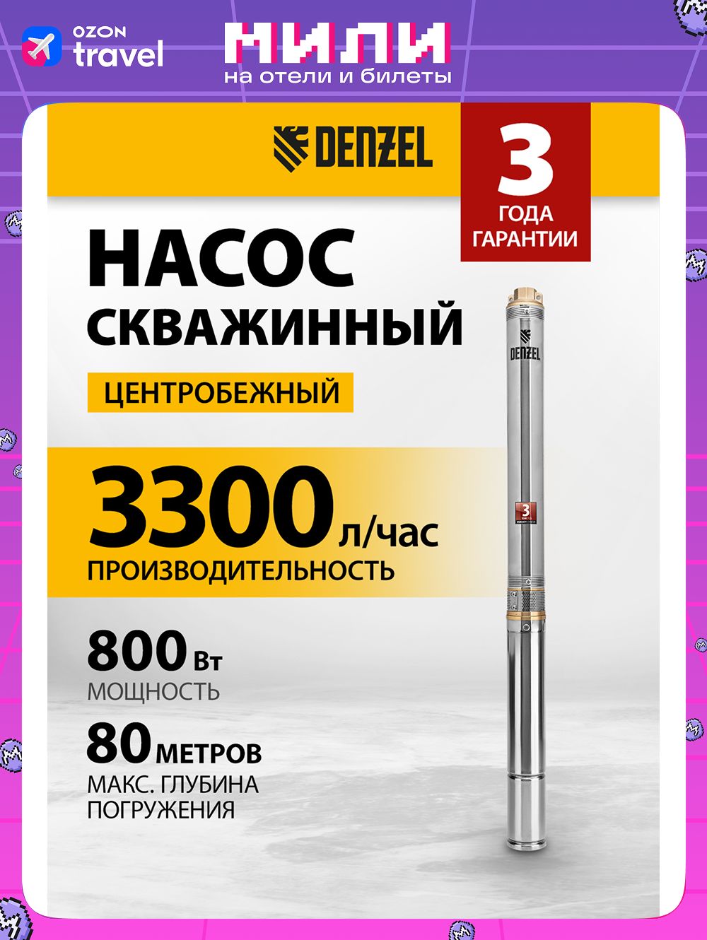 Насос скважинный DENZEL DWC-3-60, центробежный, 800 Вт, 3300 л/ч, напор 60 м и погружение до 80 м, диаметр 3 дюйма, маслонаполненный двигатель, насос глубинный для скважины 97255
