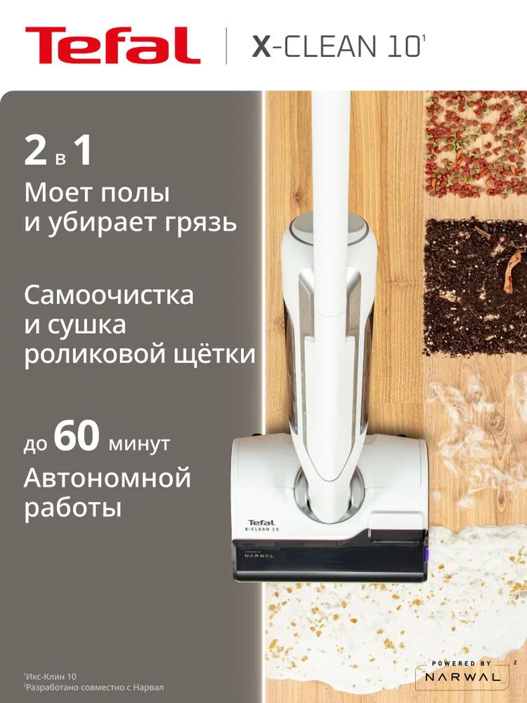 Моющий пылесос вертикальный Tefal X-Clean 10 GF7540FO, с влажной и сухой уборкой, самоочисткой и cушкой, белый