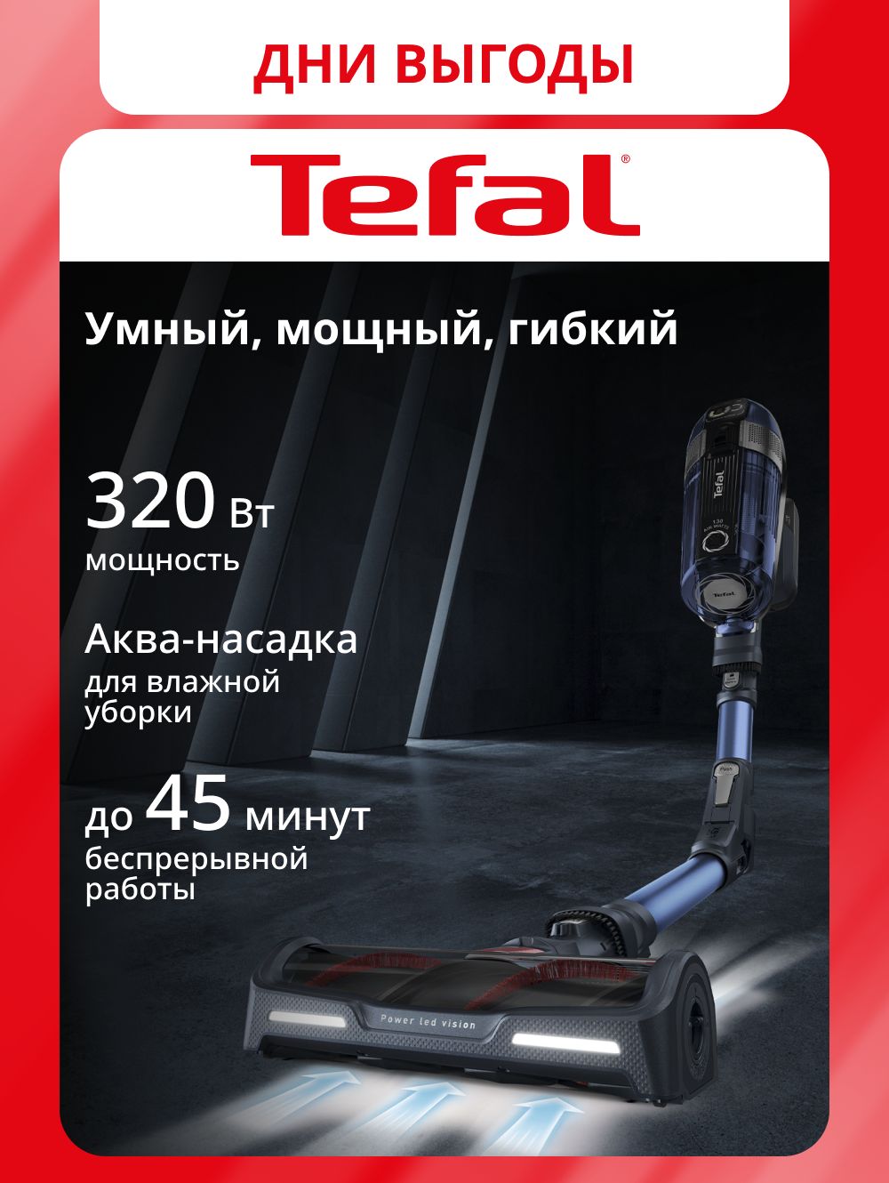Вертикальный беспроводной Tefal X-Flex 12.60 Aqua TY98C0WO с 6 насадками, время уборки до 35 мин, сухая и влажная уборка, синий
