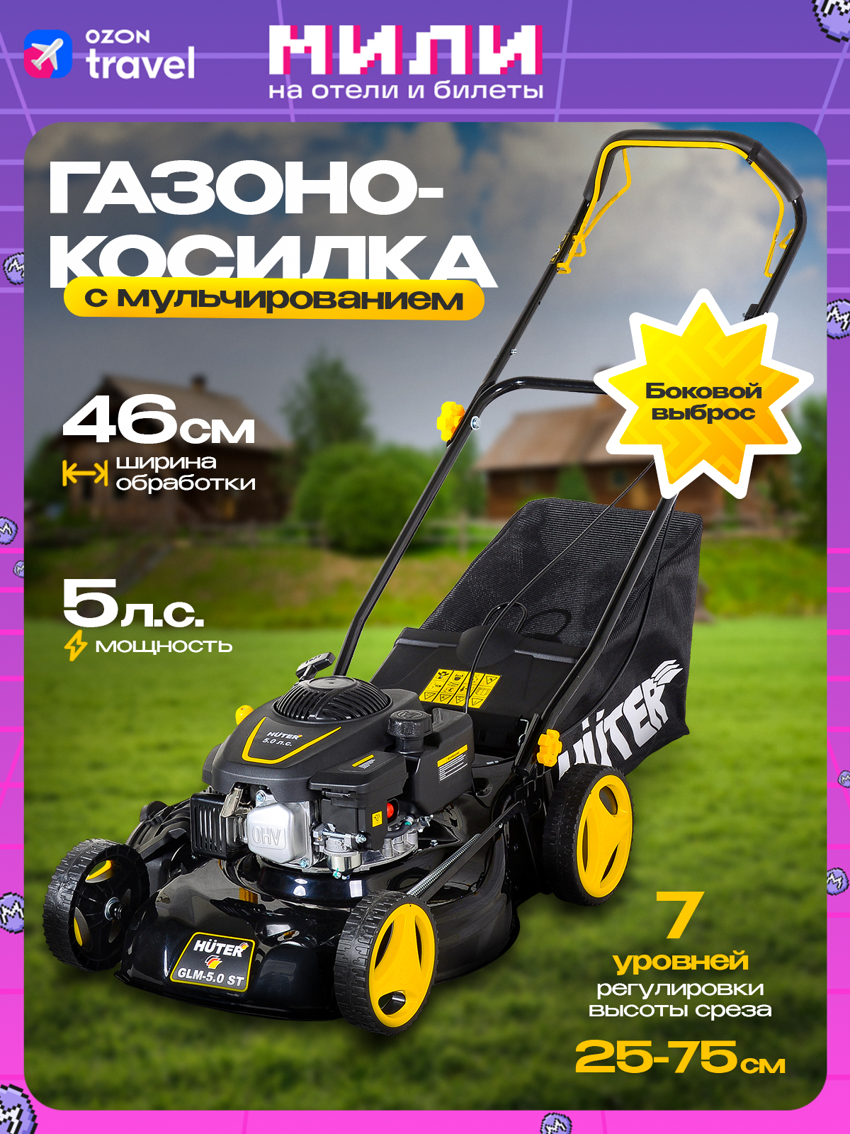Газонокосилка бензиновая самоходная 5л.с. Huter - тканевый травосборник 60л; шир. срез 460мм; мульчирование; высота 25-75 мм - GLM-5,0ST