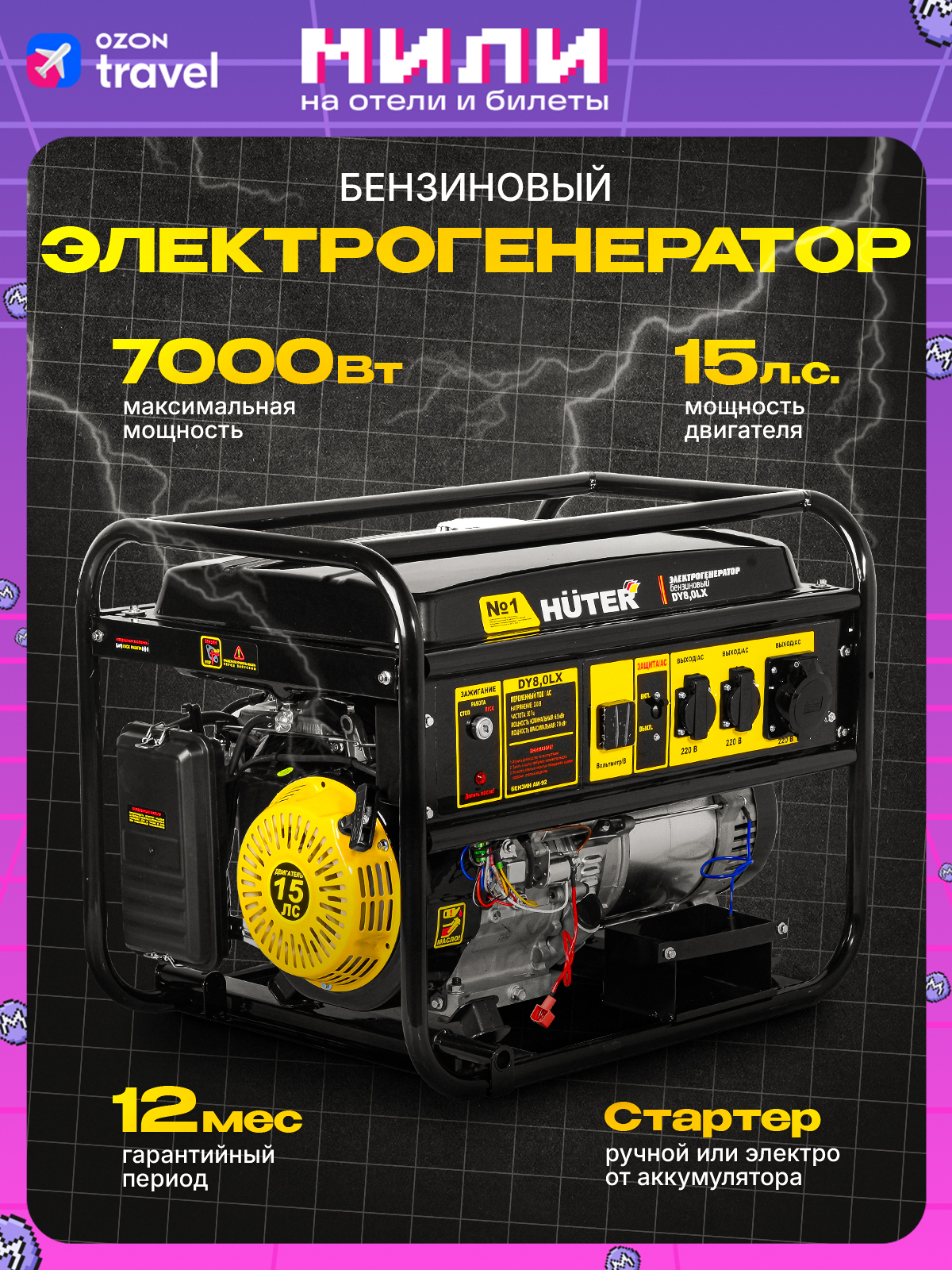 Генератор бензиновый 6,5кВт Huter 15 л.с., электростартер/ DY8,0LX
