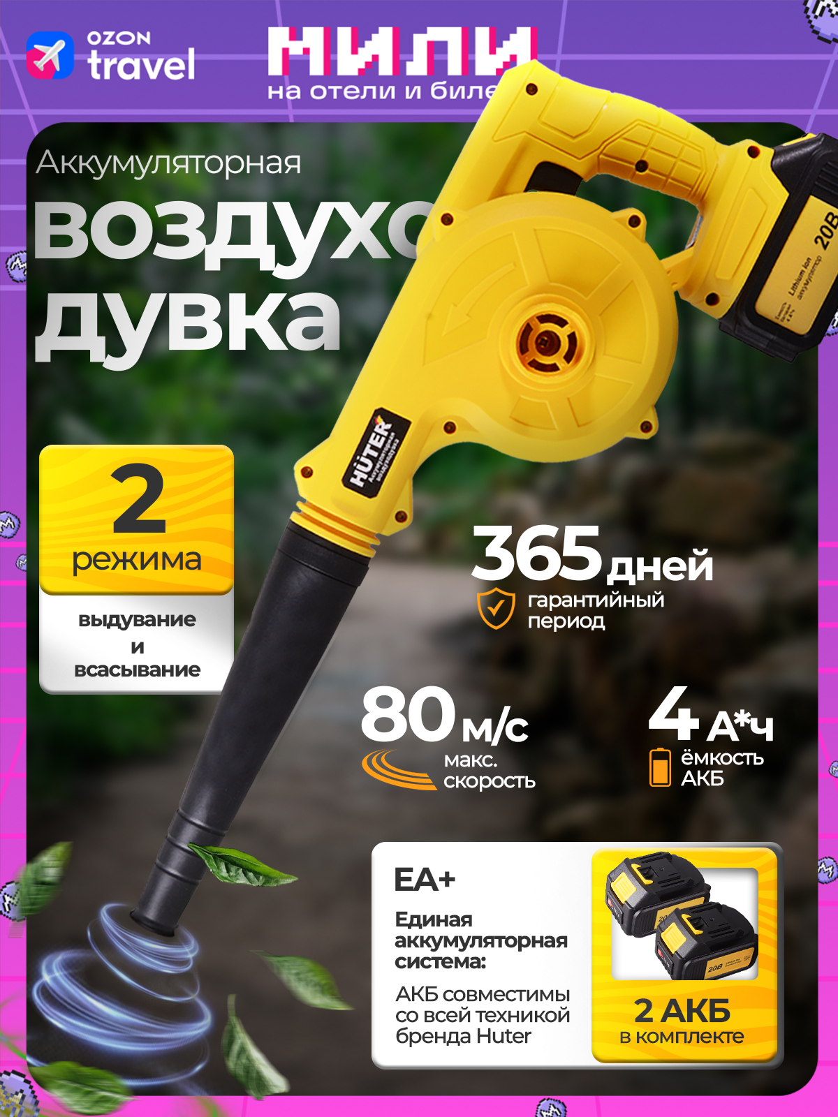 Мощная Воздуходувка аккумуляторная 80 м/с, 600 Вт Huter, в комплекте: 2 АКБ и зарядное устройство; обдув и всасывание - CB-180-20/2Li EA+