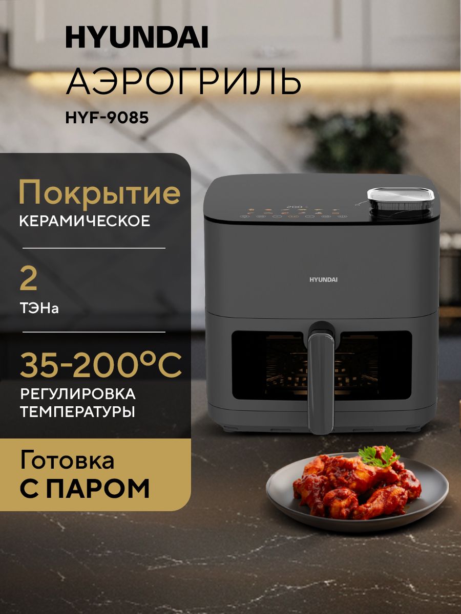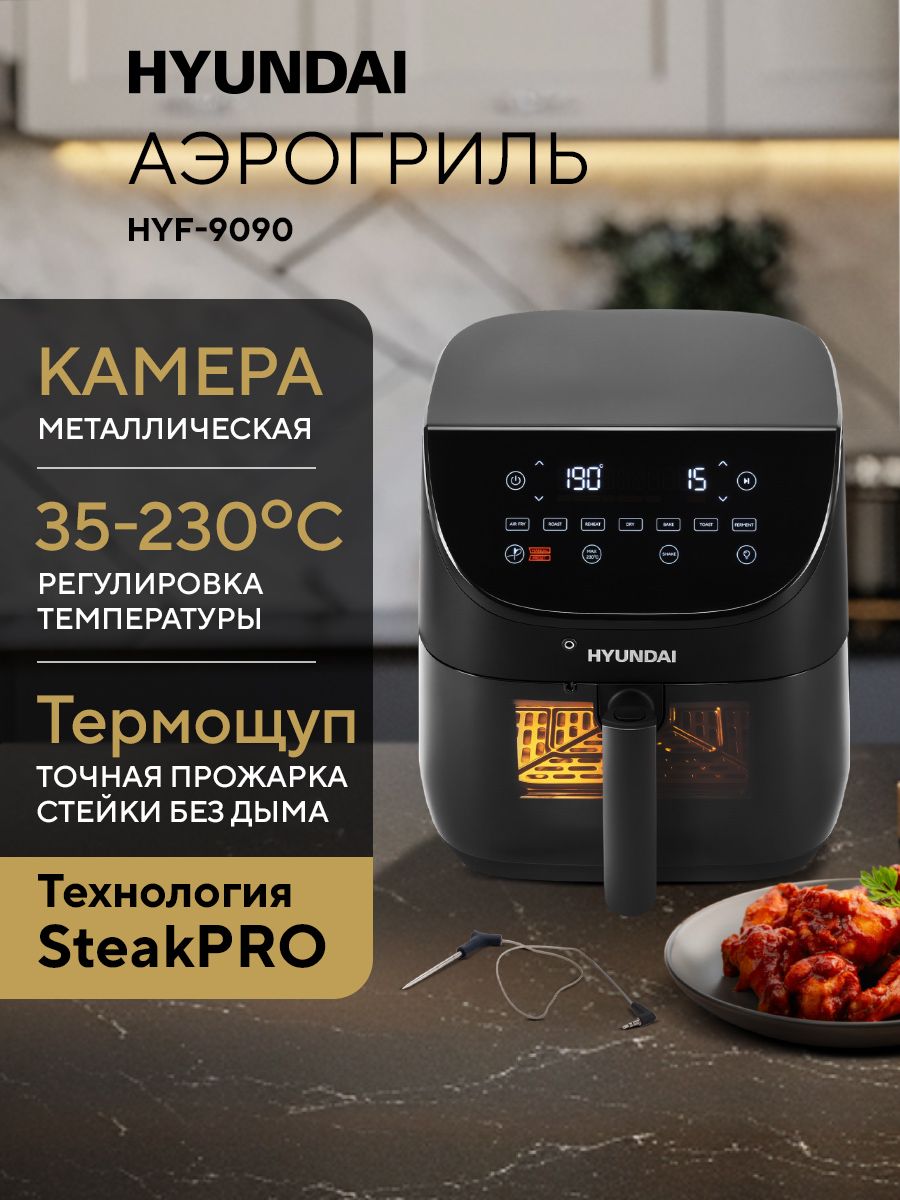 Аэрогриль с термощупом Hyundai HYF-9090, установка степени прожарки для разного типа мяса, автопрограммы и возможность сушки овощей/фруктов, ферментирование