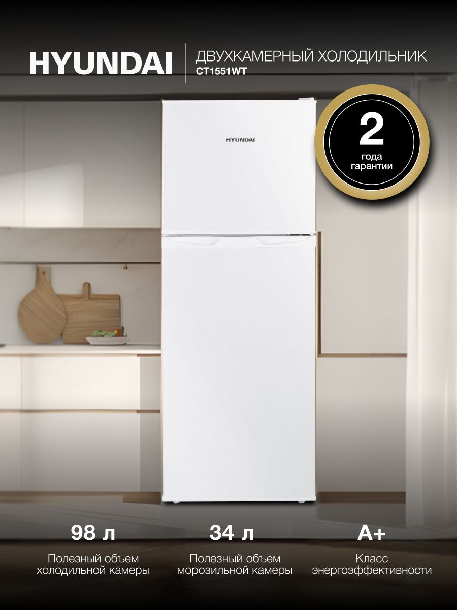 Холодильник Двухкамерный, Двухдверный с верхней морозильной камерой HYUNDAI CT1551WT, Объем 133л, Класс A+, Тихий - 39 дБ, LED освещение Белый