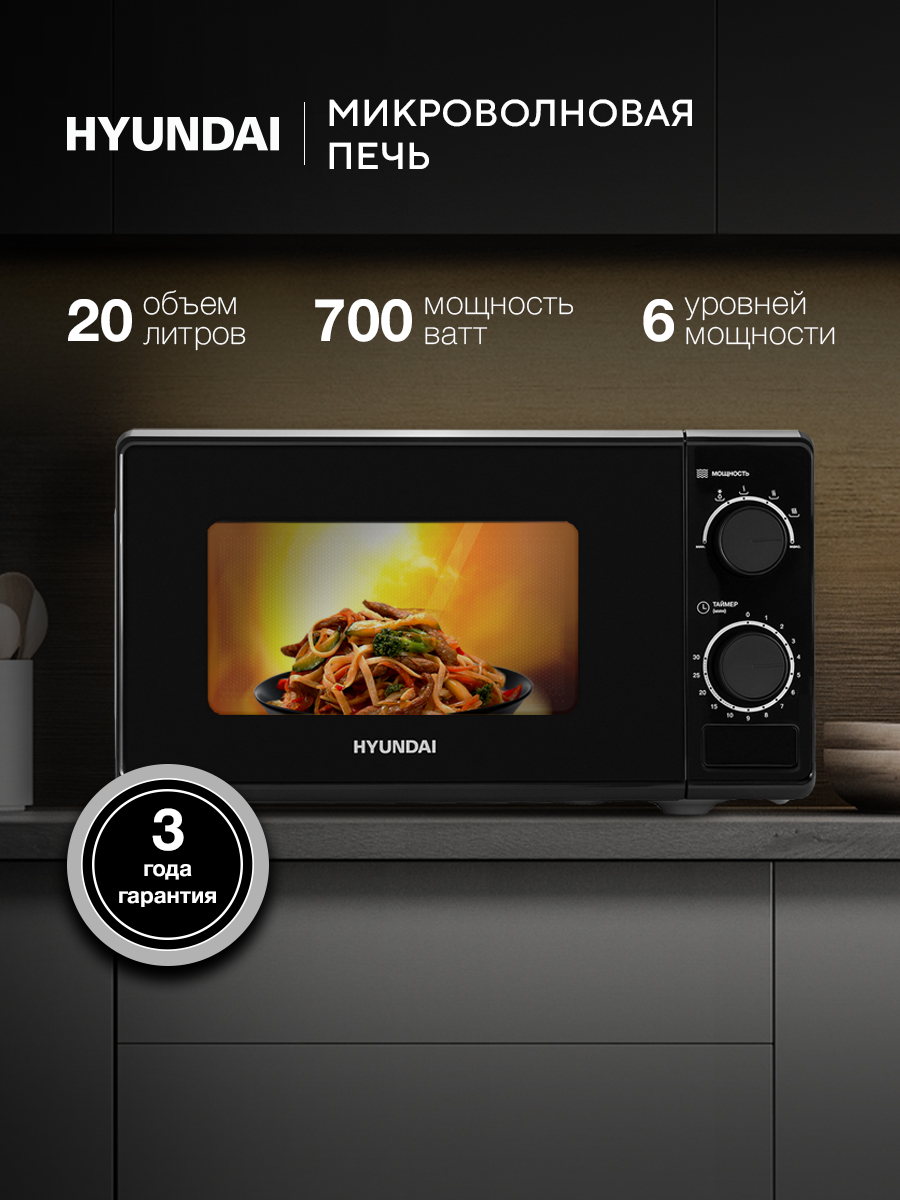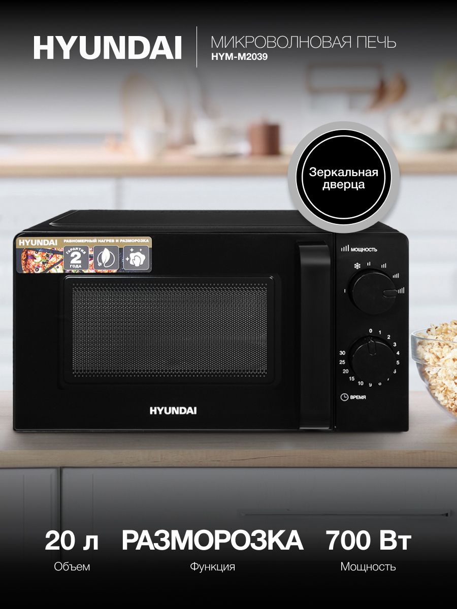 Микроволновая печь Hyundai HYM-M2039 черный, с механическим управлением, объем камеры 20 л, мощность 700 Вт, открывание дверцы ручкой, функции разморозки и поддержания тепла