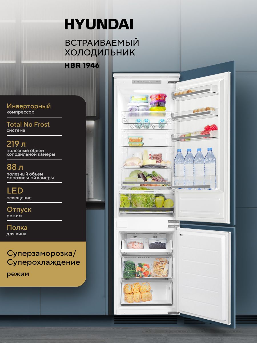 Встраиваемый холодильник встраиваемый HYUNDAI HBR 1946 Двухкамерный, Двухдверный, 200 см, Инверторный компрессор, TOTAL NO FROST