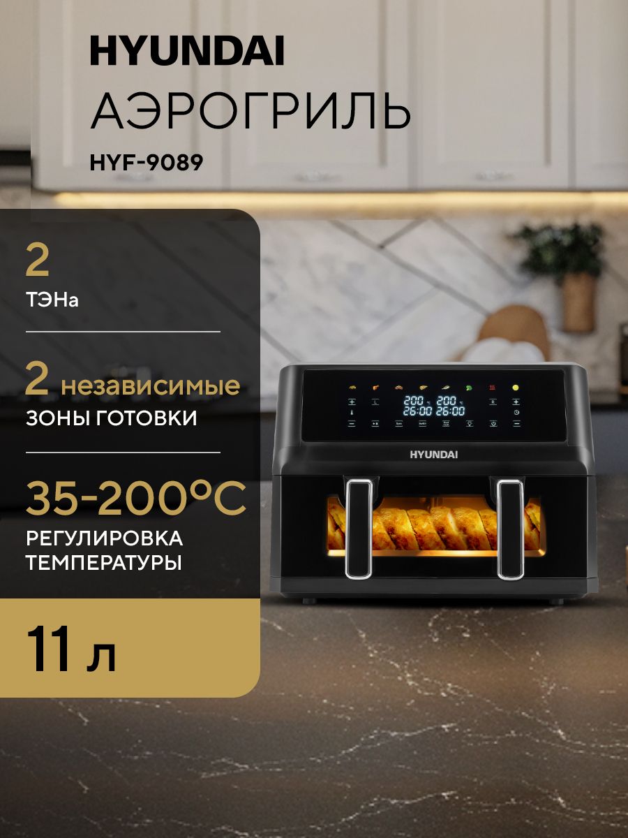 Двух зонный аэрогриль Hyundai HYF-9089 для готовки двух разных блюд одновременно, общий объем козин 11 л, сенсорное упраление