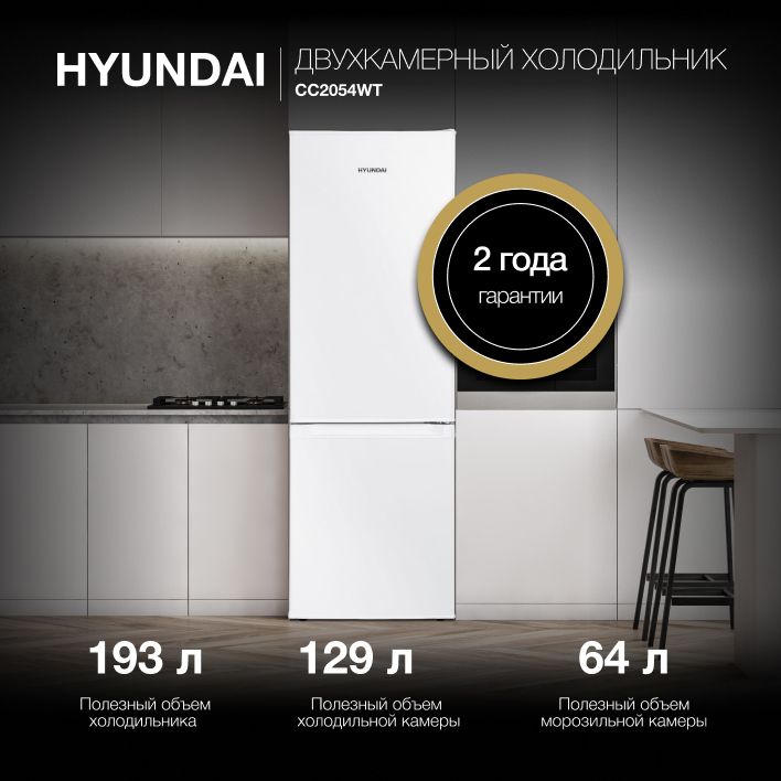 Холодильник Двухкамерный Двухдверный, с нижней морозильной камерой HYUNDAI CC2054WT, Общий объем 168л, Класс A+, Тихий - 39 дБ, LED освещение, Высота 143 см, Белый