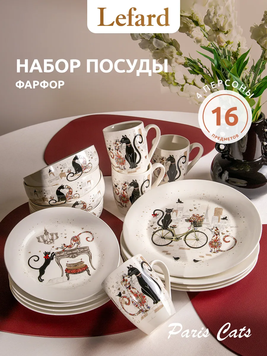 Набор посуды столовой 4 персоны "Парижские коты" фарфор